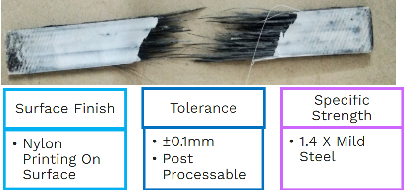 Composite part manufacturing is labor-intensive, costly, and needs to perform complex methods such as vacuum bagging. Because of these composite applications are limited to only the high-end aerospace industries. On the other hand, 3D printed thermoplastic parts are weak to be used as structural components. Because of COVID-19 product industries are most affected compared to software industries. Virtual development of products becomes impossible because of the need of prototyping. This problem can be solved by continuous fiber 3d printing. In this project, the solution is proposed to solve the above problems. By printing continuous carbon fiber embedded in nylon and using it in 3d printing, the strength part should be significantly increased. By achieving merely 35%-40% of fiber fraction printed parts could have strength comparable to steel.