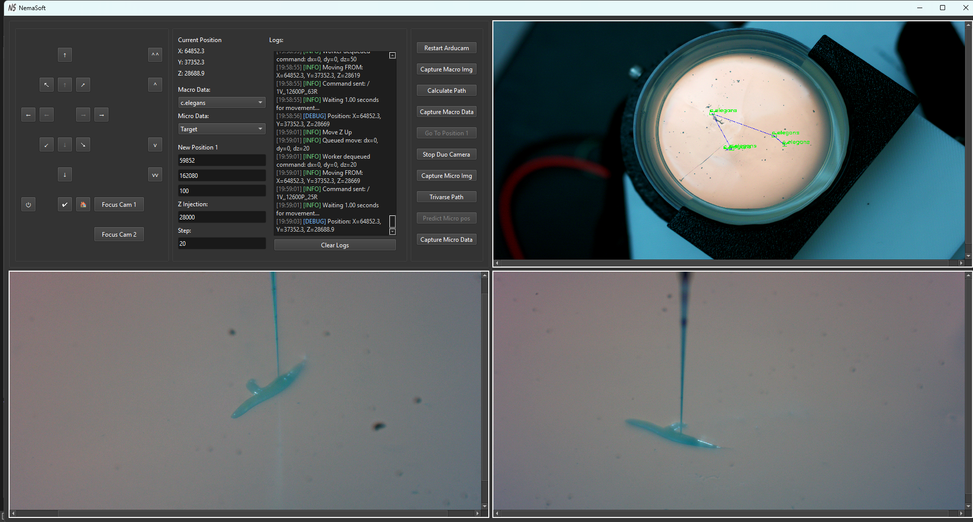 This project presents an automated microinjection platform for C. Elegans, integrating standardized preparation methods, immobilization of c.elegans, and precision needle control. A dual imaging system—macro and micro—combined with computer vision allows accurate detection and targeting. The hardware is driven by a software suite with a GUI that manages motion, pressure, and needle positioning. YOLO-based object detection aids worm localization, while hydrogel and anesthetics improve immobilization for injection.